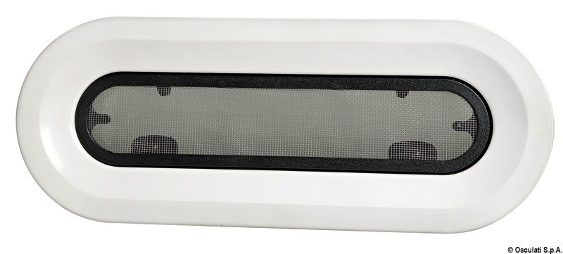 Carcassa in nylon con ghiera esterna di finitura e zanzariera. Fermi regolabili. Vetro acrilico fumè.