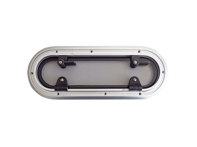 Oblò semiellittico apribile in lega leggera anodizzata, con cerniera a frizione per bloccare l’apertura nella posizione desiderata.Metacrilato da mm. 10.