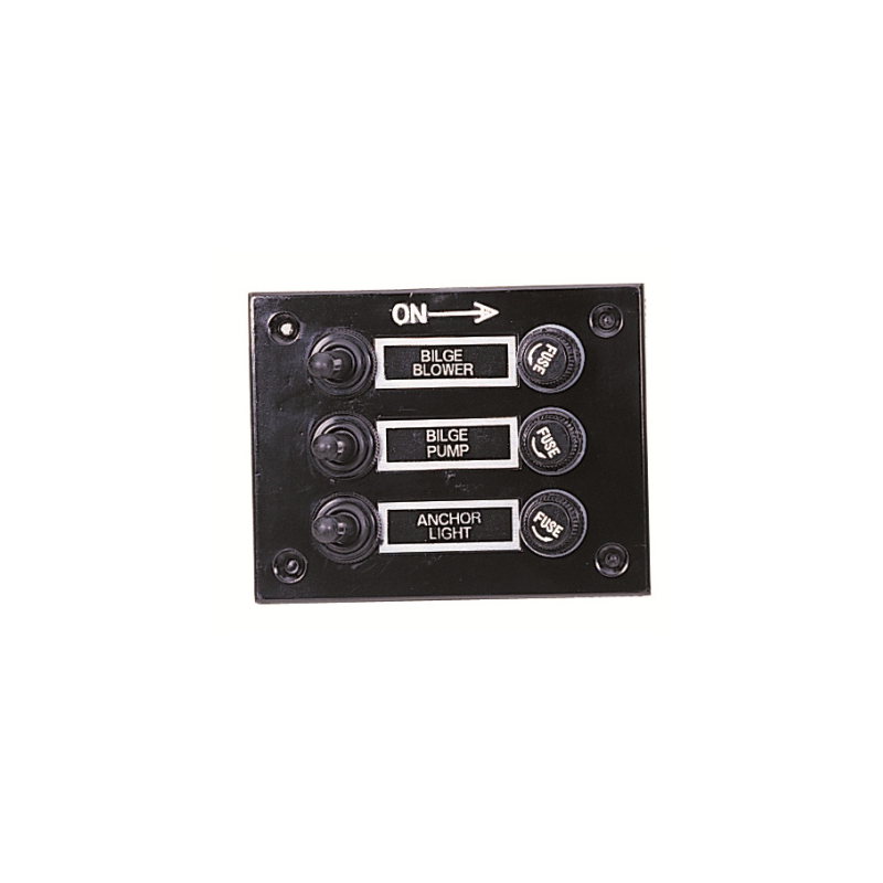 Pannello elettrico in ABS nero, con interruttori a leva (2 x ON-OFF e 1 x momentaneo) protetti da cappuccio in gomma e portafusibili completi di fusibili invetro da 5 AMP (6,3x32).