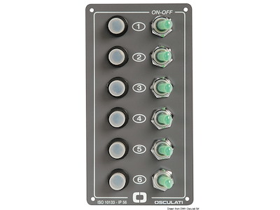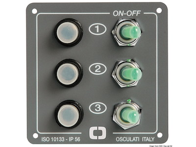 Interruttori a levetta luminosi. Fusibili automatici riarmabili.