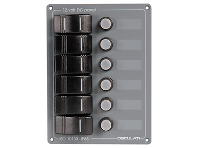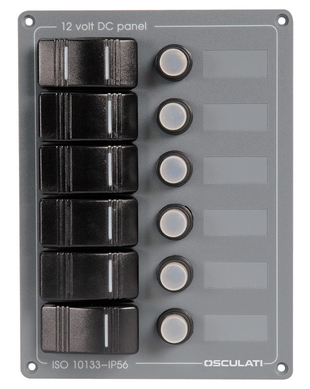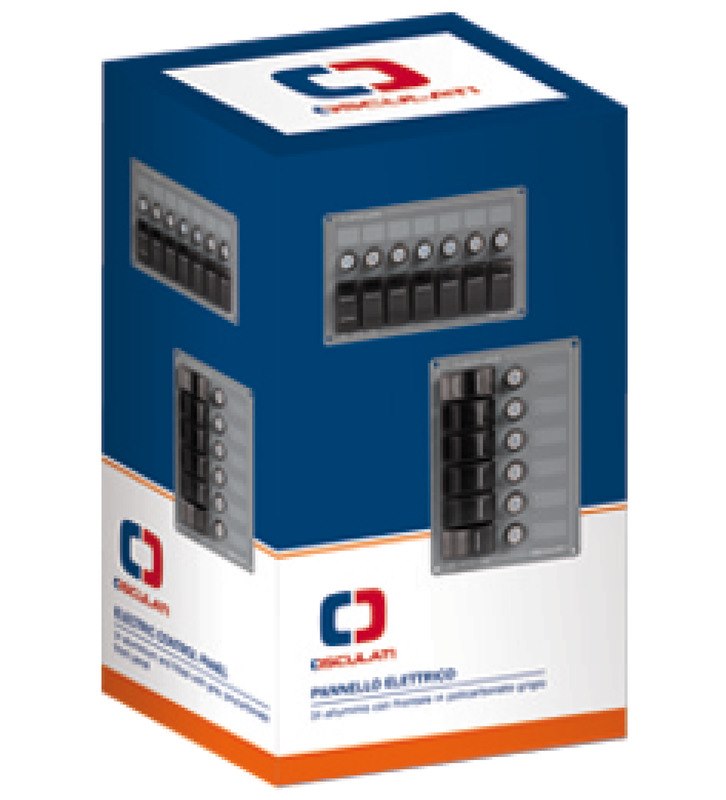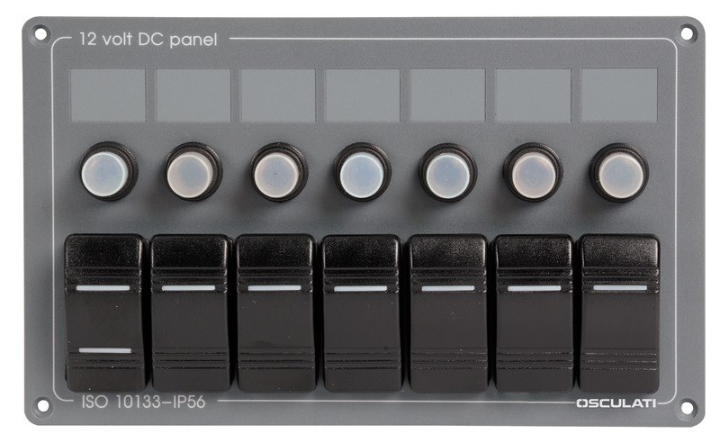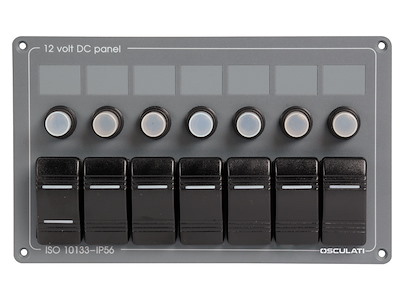 Provvisti di interruttori a bascula stagni, con incorporata illuminazione in posizione ON. Il primo ha 3 posizioni con ON-OFF-ON con due circuiti separati, l'ultimo é a molla per la tromba. Completi di fusibili automatici riarmabili stagni (14.845.06: 3 da 10 A, 2 da 15 A, 1 da 20 A; 14.855.07: 4 da 10 A, 2 da 15 A, 1 da 20 A). Grado di protezione IP56. In dotazione le tabelle complete in policarbonato autoadesivo, con scritte delle varie funzioni, sia in italiano, inglese, tedesco.