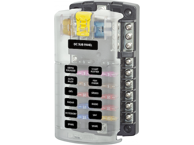 Pannello porta fusibili ST Blade in policarbonato rinforzato, per fusibili ATO/ATC. Barre e contatti in rame argentato. Barra di distribuzione polo negativo inclusa. Copertura isolata. Rif. originale 5025