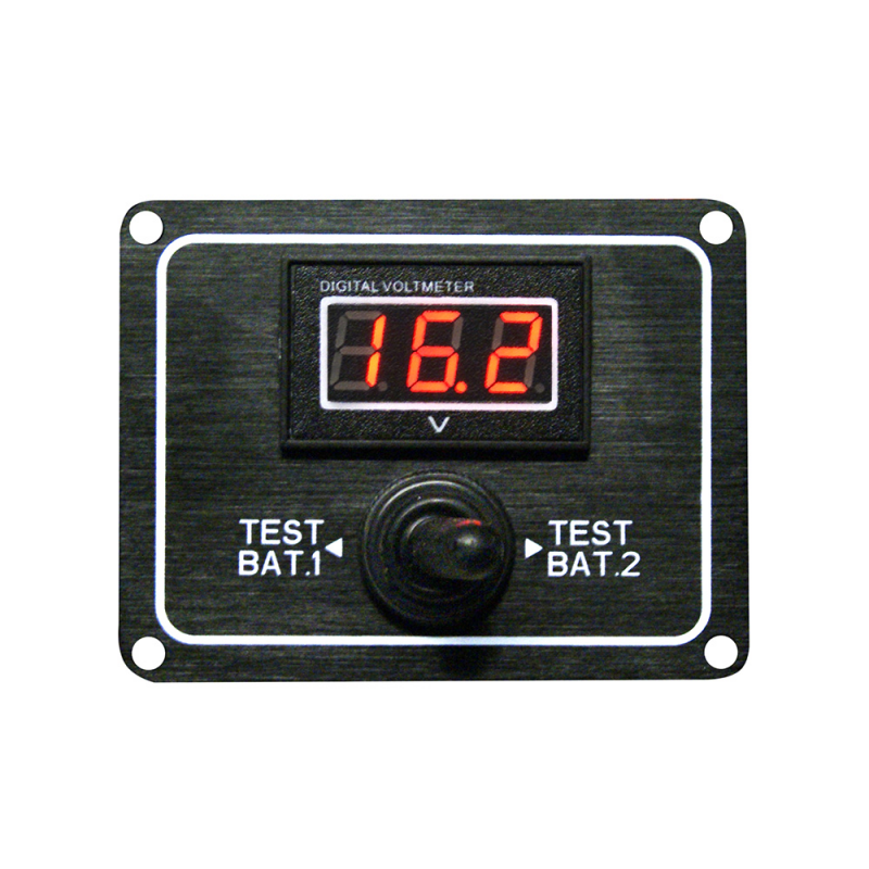 Pannello in lega leggera verniciato nero con indicatore digitale. Permette di verificare lo stato di due batterie separate o di due gruppi batterie separati. Alimentazione 12V, fissaggio tramite 4 viti. Dim. mm. 64x83.