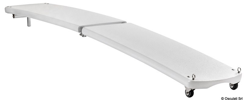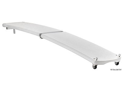 Struttura realizzata in carbonio a più strati e con profili d'alluminio di supporto. Cerniere in alluminio anodizzato. Ruote con carcassa inox, con anelli che permettono il sollevamento della passerella. Provvista di doppio perno pivotante. Si può montare con un solo perno e la passerella può brandeggiare, oppure con due perni che consentono il solo movimento verticale (entrambi i perni sono inclusi). Disponibile in diverse configurazioni di piano di calpestio:superficie anti-scivolo bianca, EVA marrone ed EVA grigio.