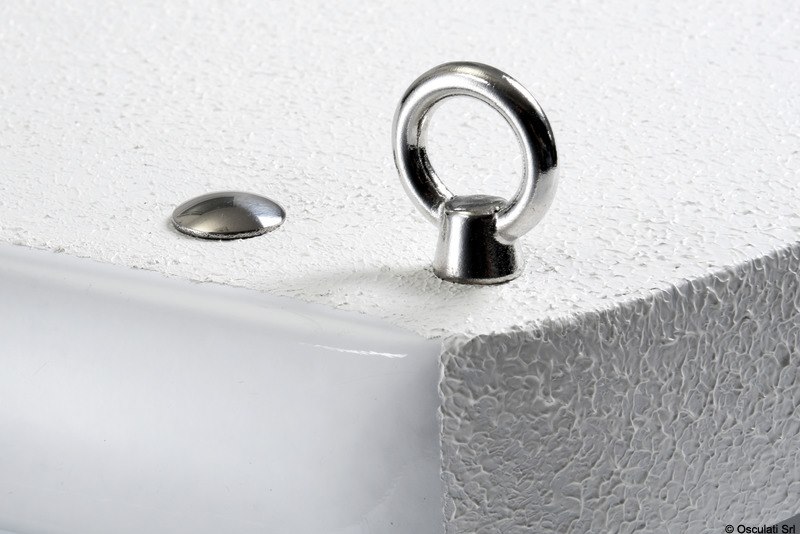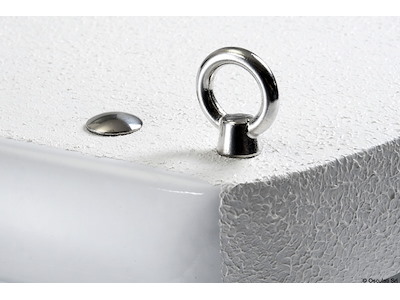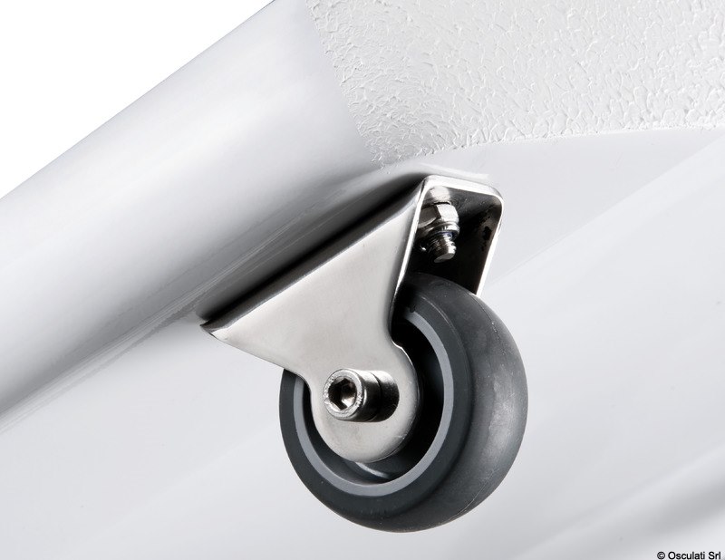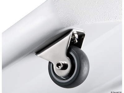 Ruote con carcassa inox, con anelli che permettono il sollevamento della passerella. Provvista di doppio perno pivotante.
