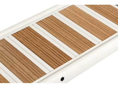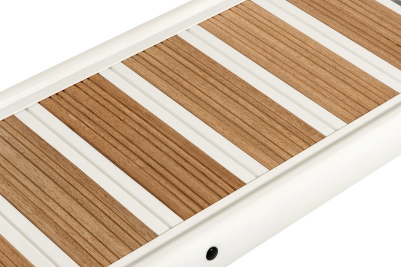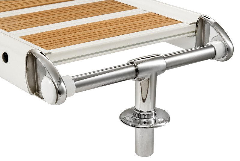 In alluminio verniciato bianco, con accessori in acciaio inox AISI 316 lucidati a specchio e ripiano in alluminio con inserti EVA similteak. Bicchiere in acciaio inox.