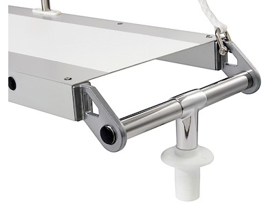 In alluminio anodizzato, con ripiano rivestito di materiale antisdrucciolevole bianco pieghevole. Versione pieghevole, le due parti si possono infatti separare tramite due spine a scatto inox.