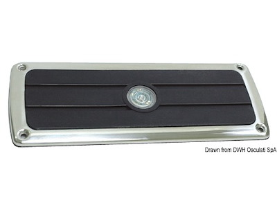 In acciaio inox AISI 316 lucidato a specchio, inserto in plastica morbida nera, con illuminazione tramite LED BIANCO annegato al centro della plastica.