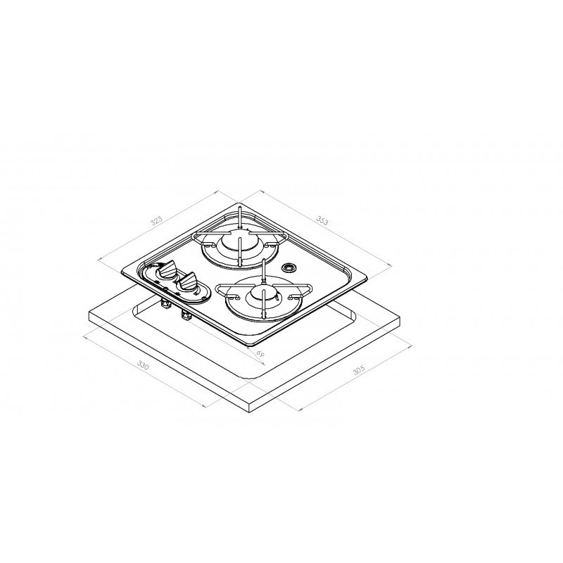 Piano cottura a gas con accensione manuale, in acciaio inox lucidato a specchio. Montaggio ad incasso. Con termocoppia di sicurezza. Completo di viti di fissaggio. Con foro per ferma pentole. Certificati CE. Fuochi: 2 Portata: 2,8 KW Dimensioni: 323X353 MM Incasso: 305X330 MM Peso: 2,5 KG