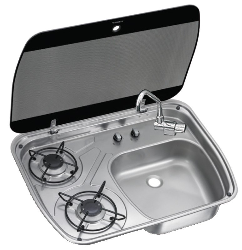Completo di lavello e rubinetto abbattibile (acqua fredda) in ottone cromato. Versione Cramer con accensione di sicurezza piezoelettrica, griglie rimovibili, bruciatori in acciaio inox, guarnizione in gomma.