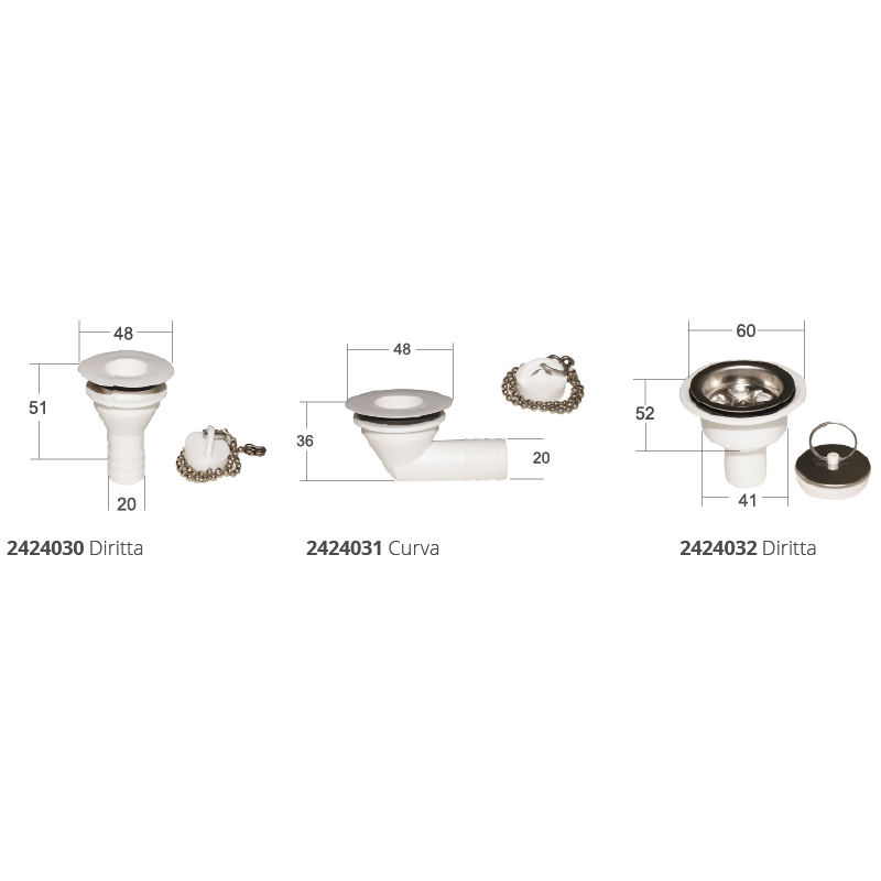 Piletta scarico Ø mm. 20 completa di guarnizione in gomma, tappo e catenella