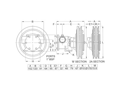 Pompa in bronzo da 1" BSP. La pompa ha dimensioni di 160 mm di lunghezza e puleggia di 180 mm di diametro. Con un fusibile da 2,5 A, può erogare una portata di 80 litri/minuto a 1500 giri/min e una prevalenza totale di 3 m.