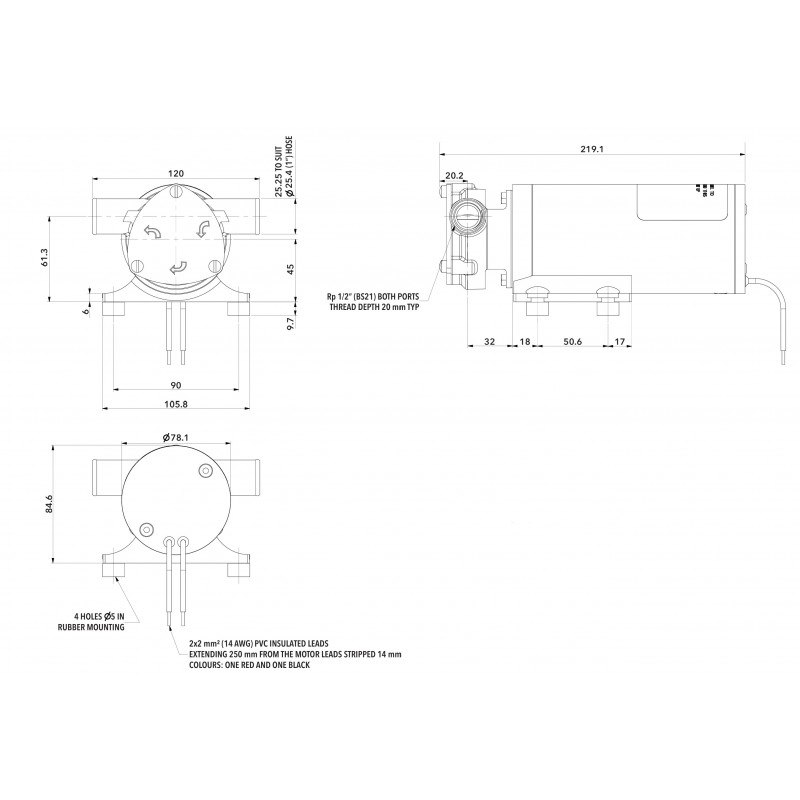 Pompa di circolazione e sentina per applicazioni professionali, adatta al funzionamento continuo.Autoadescante fino a 2,4mErogazione 47 litri/minuto max, 44 l/m a 3m di altezza.Con testa della pompa in bronzo e girante in nitrile resistente all'olio.Connessioni: Diametro interno del tubo da 25mm (1") direttamente alle porte di ingresso/uscita o tramite raccordi con filetto maschio BSP da 13mm (1/2") (non inclusi).Assorbimento di corrente 21A, fusibile 25ADimensioni: Altezza 9cm / Larghezza 12cm / Lunghezza 22cm