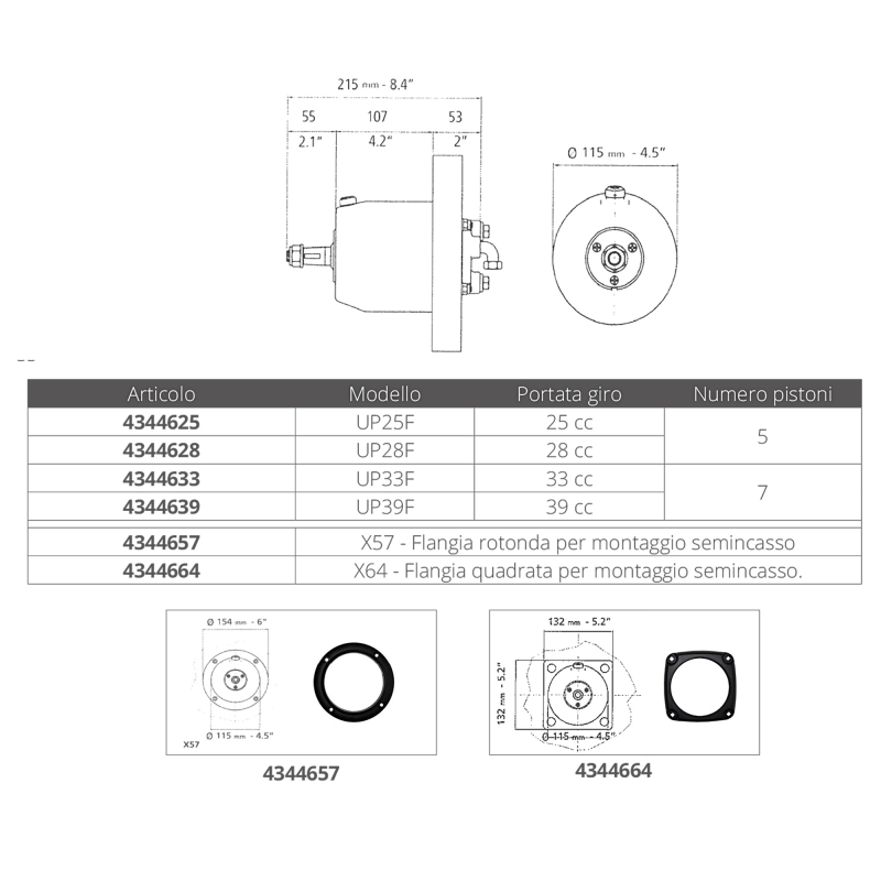Pompa montaggio frontale, struttura compatta, sistema pistoni assiali, valvola di non ritorno che impedisce la reversibilità, valvola di protezione alle sovrapressioni, alberino conico da 3/4 in acciaio inox, rotore in ghisa per una maggiore durata, riempimento olio frontale, predisposte per raccorderia da 1/4 NPT, per tubo da 3/8 complete di raccordi a gomito. Possibilità di montaggio a semincasso.
