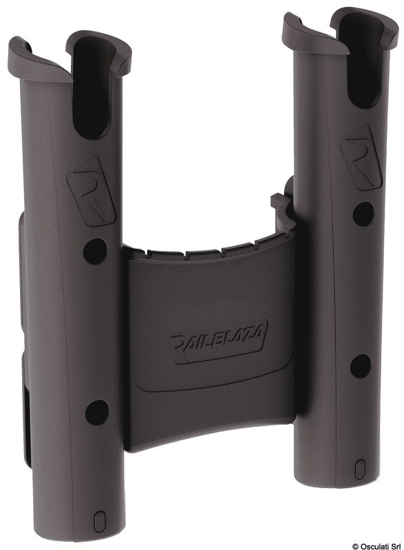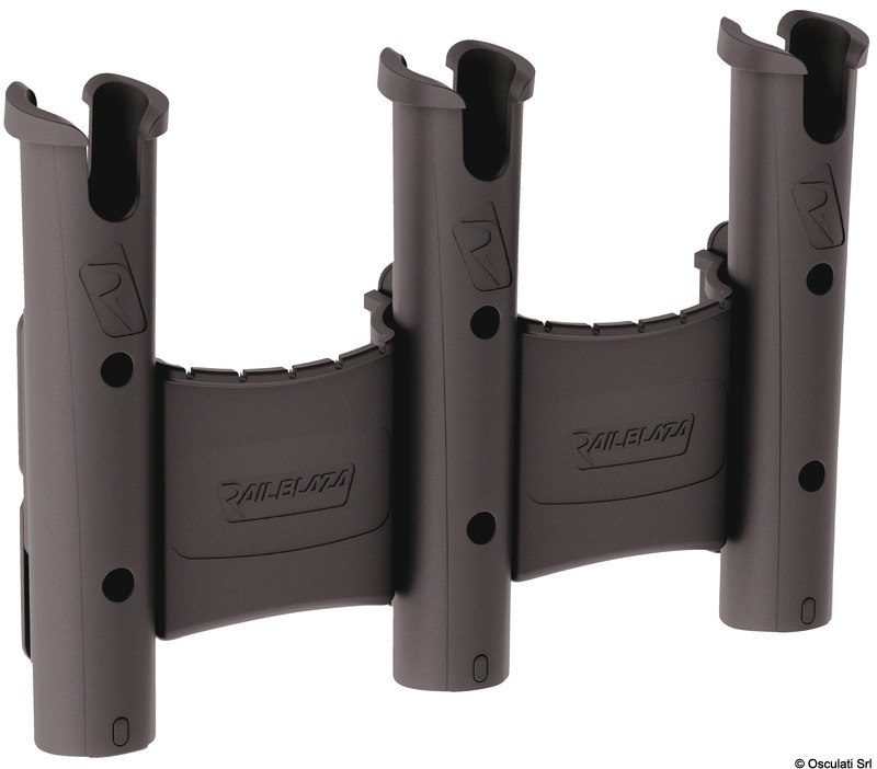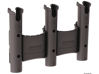 Portacanne singolo o modulare (si possono collegare i moduli tra loro senza fine). Adatto ad impugnature fino a 40 mm. Perno di fine corsa che impedisce la rotazione della canna (removibile). Nelle versione multiple (tra le due canne) vano per esche, attrezzi ed altro.