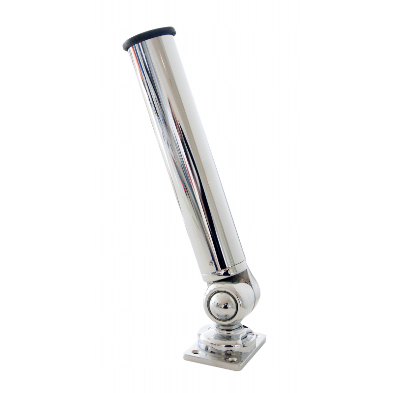 Portacanna in ottone cromato ad inclinazione regolabile a scatti di 15°, completo di guarnizione per la canna. Base di fissaggio rettangolare con 4 fori, con innesto nella base che lo rende asportabile.