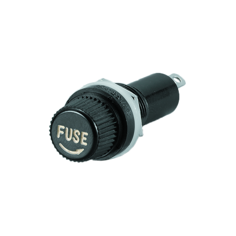 Portafusibile da incasso Max 10A, tappo a vite, contatti in ottone argentato, corpo in makrolon caricato vetro, foro Ø mm. 16. Per fusibili (art. da 3939120 a 126) in vetro da Ø mm 6,3 x lung mm 32.