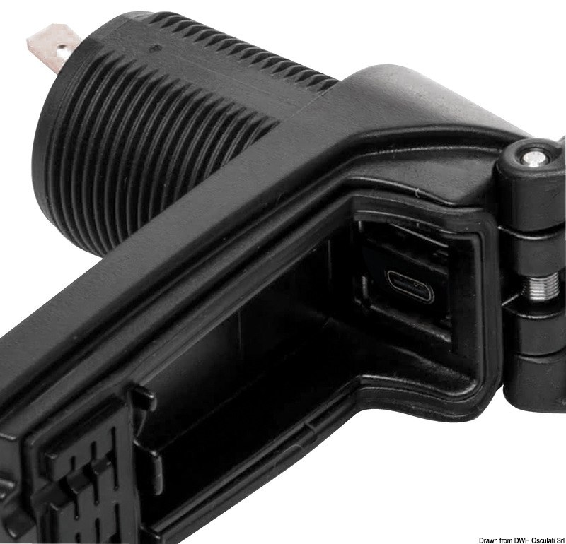 USB impermeabile a ricarica rapida, con connettività a doppia presa, in grado di ricaricare fino a due dispositivi più velocemente rispetto alle prese USB standard.
