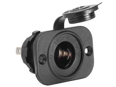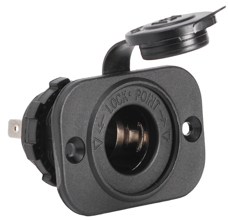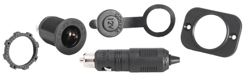 Completamente impermeabili , sia con la presa chiusa dal cappuccio in dotazione, sia quando é inserita la spina, che é dotata di uno speciale collare stagno e di un sistema “lock-in” che permette di bloccare la spina ruotandola. Montaggio presa sia con dado posteriore, che con pannellino a due viti. Standard per accendisigari, telefonini.