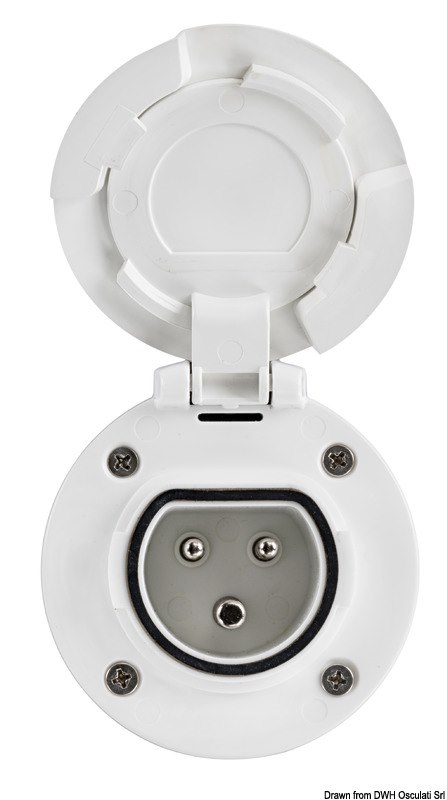 La spina è disegnata per garantire una impugnatura ergonomica e la ghiera rotante permette di assicurarla saldamente alla presa in barca con una chiusura stagna IP67, mentre il tappo in gomma garantisce una tenuta IP44 quando non è collegata.