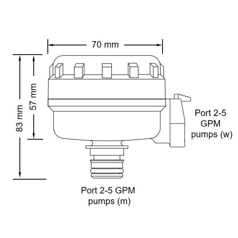 Pumpgard Filtro a 40 maglie (aperture di circa 0,4 mm), con design a 90°, connessione a innesto in ingresso (f) per porta x uscita porta a innesto (m) per pompe Jabsco / Flojet da 2-5 GPM. Pressione massima 5 bar (70 PSI).Dimensioni: lunghezza circa 70mm (più porta) / larghezza circa 70 mm / altezza circa 83 mm