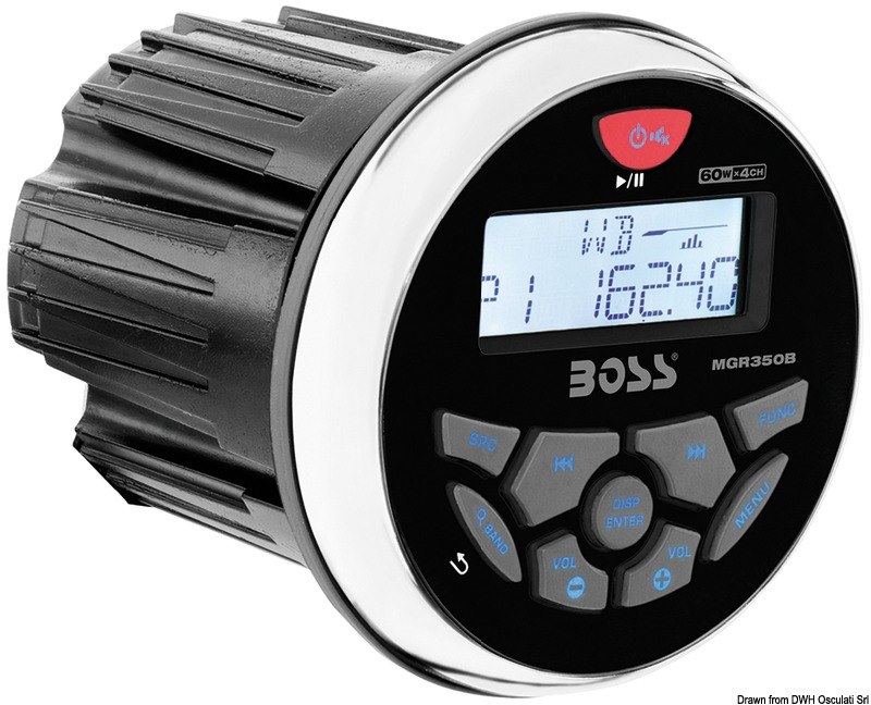 Radio AM/FM con sistema RDS. Ingressi USB e AUX 3,5 mm sul retro (collocabili in plancia mediante accessorio 29.530.08).