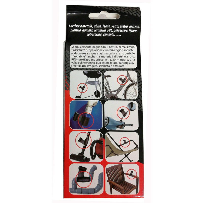 Nastro in tessuto adesivo di fibra di vetro imbevuto di resina poliuretanica che indurisce al contatto con l’acqua. Ideale per riparazioni rigide e strutturali di emergenza o definitive su metalli, ghisa , legno, vetro, pietra, marmo , plastica, gomma , ceramica, PVC, polyestere, Nylon, vetroresina, cemento. Resistente fino a temperature vicine ai 150°. La fasciatura diventa rigida dopo dieci minuti dall’applicazione e raggiunge l’indurimento strutturale in 24 ore. Una volta indurito può essere carteggiato, levigato o verniciato.