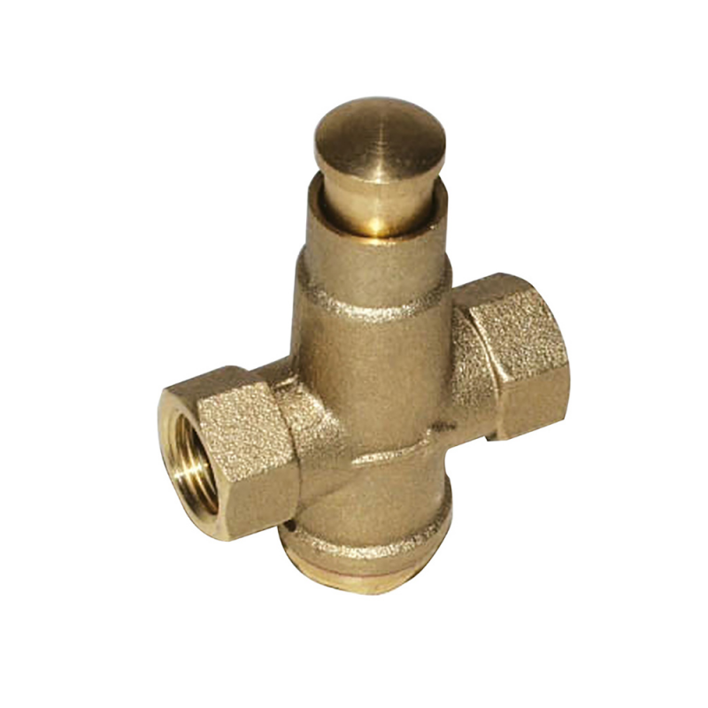 Valvola a pulsante in ottone, ideale per livello serbatoio. Filettatura F/F 3/8” gas. si apre tenendo premuto il pulsante e si chiude non appena rilasciato.