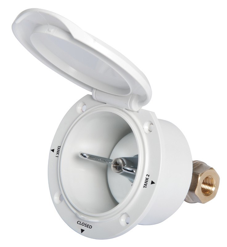 Rubinetto a 3 vie per collegare due serbatoi ad un motore. Tre posizioni tank 1 / tank 2 / chiuso.