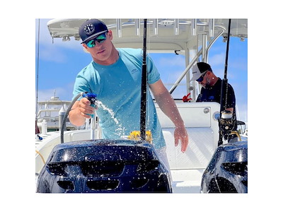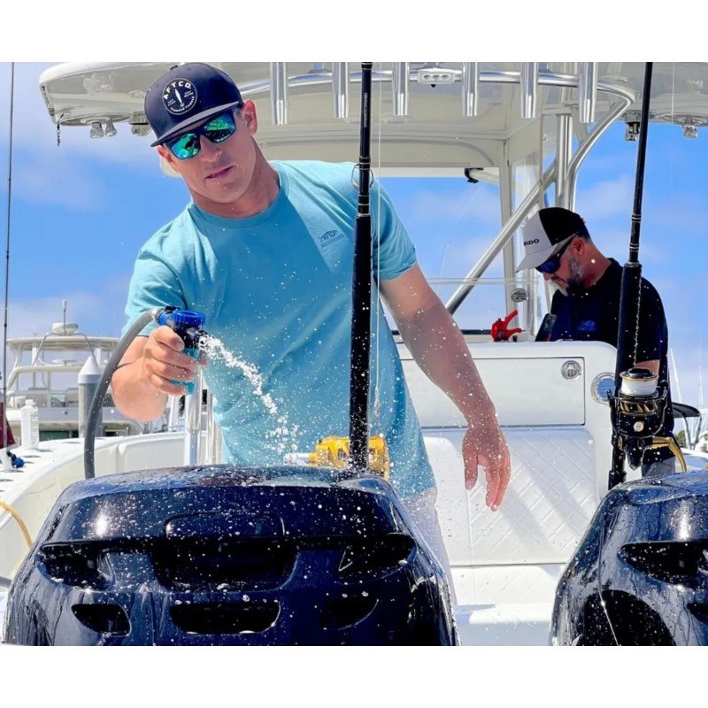 Consente la semplice applicazione di Salt Off Protector su tutte le superfici metalliche o per lo spurgo del motore. L’applicatore funziona con un tubo dell’acqua collegato a delle cuffie di lavaggio del motore o ad un ugello a spruzzo. Per rimuovere i depositi di sale da superfici marine esterne, rimorchi, attrezzature per immersioni, canne e mulinelli da pesca: Riempire la tazza dell’applicatore con Salt Off Protector. Collegare un’estremità dell’applicatore a un tubo dell’acqua e l’altra a un ugello di irrigazione. Assicurarsi che la manopola nera dell’applicatore sia in posizione “On” e quella blu in posizione “Mixture”. Saturare accuratamente tutte le superfici da trattare, lasciando assorbire per 5-10 minuti. I depositi più ostinati possono richiedere una leggera spazzolatura. Risciacquare con acqua dolce e lasciare asciugare all’aria le superfici trattate. Il pratico interruttore consente di controllare la portata verso la superficie trattata.