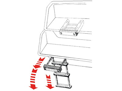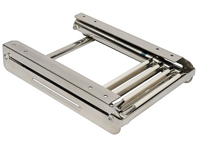 Completamente in acciaio inox lucidato a specchio. Gradini ovali con pedana in plastica bianca, versione con fermo frontale scatolato della parte sfilabile.