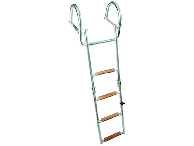 Scaletta pieghevole e ribaltabilein acciaio inox AISI 316 con maniglioni di risalita. Applicazione sopra la plancetta. Gradini in legno.