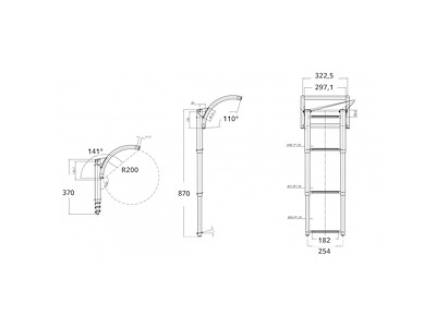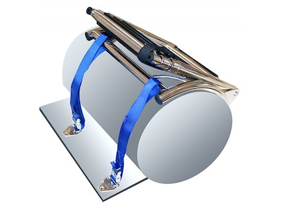 Scaletta per gommoni in acciaio inox AISI 316, telescopica e ribaltabile. Gradini in plastica nera antiscivolo. Munita di maniglia di risalita. Si fissa al pagliolo con due piastrine (non incluse nella confezione) e due fibbie autobloccanti in acciaio inox regolabili. Per tubolari fino a Ø mm. 500.