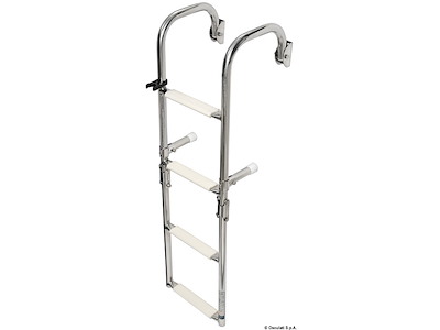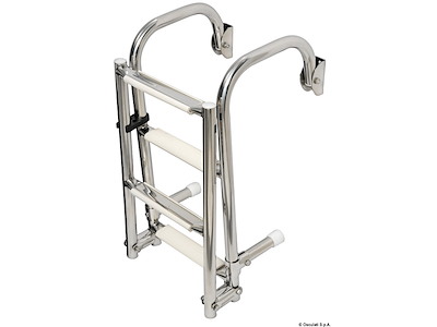 In acciaio inox lucidato a specchio con attacchi arcuati sopra coperta, per una più comoda risalita. Modello con gradini con superficie ovalizzata. Il gradino ovale, rispetto ai tradizionali tondi, é molto più agevole e comodo nell’uso. I gradini nella parte superiore sono ricoperti di pedana in plastica antiscivolo.