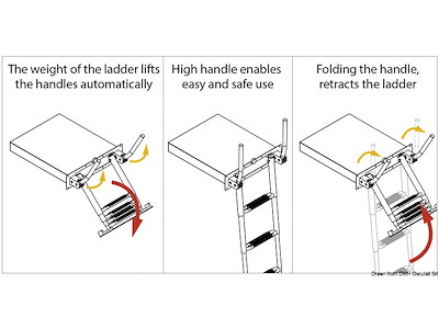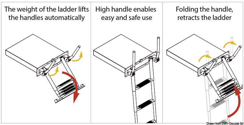 Il meccanismo di chiusura maniglia facilita il recupero della scaletta dalla plancia. Estrazione della scaletta guidata che determina un migliore scorrimento e precisione di movimento.