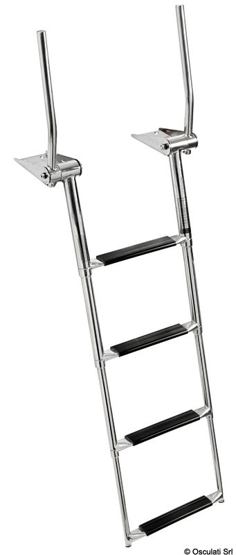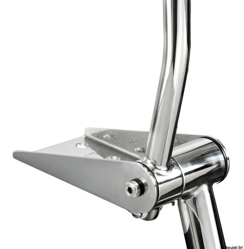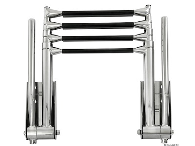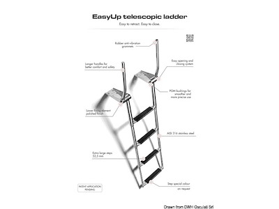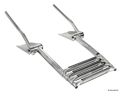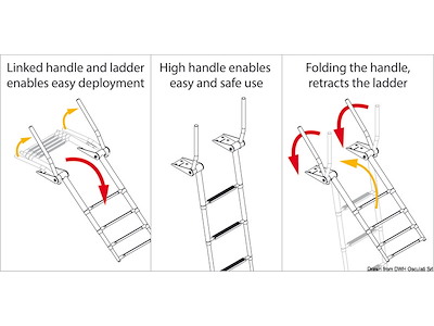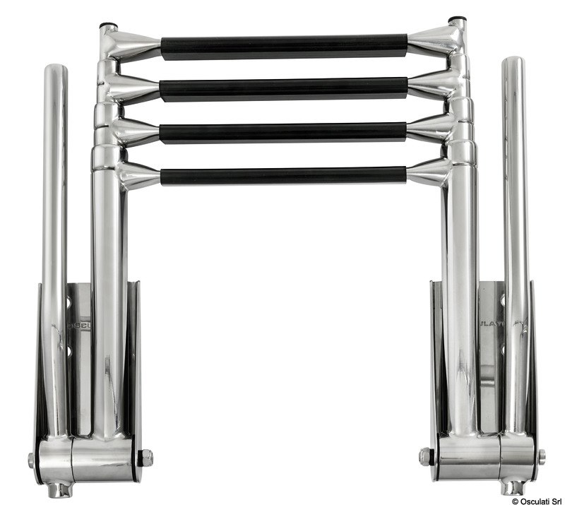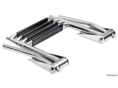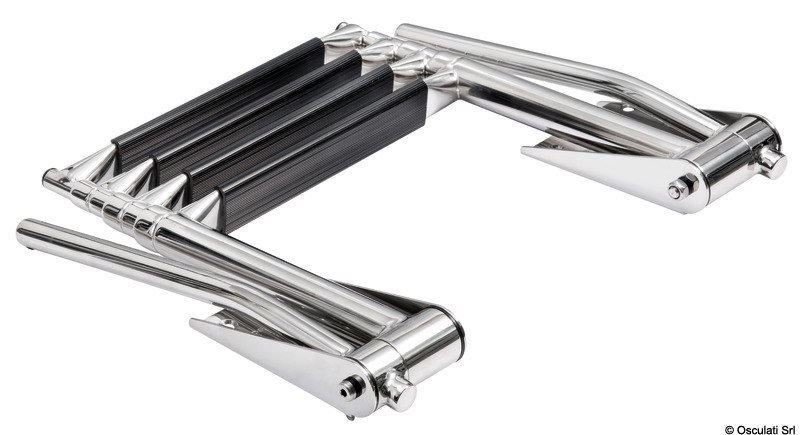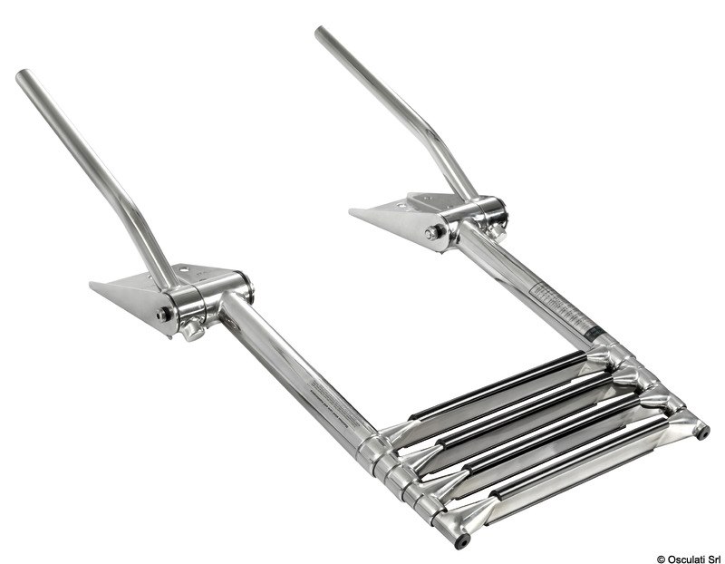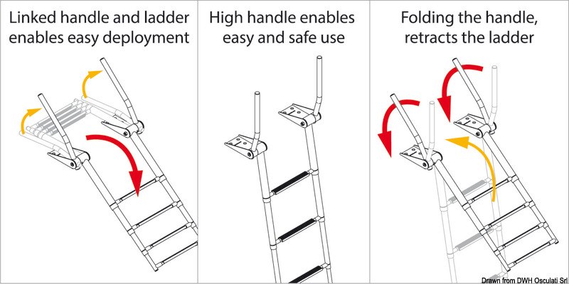 Le maniglie di presa si alzano automaticamente aprendo la scaletta. Abbassando le maniglie la scaletta si ritrae. Gradino tipo "Extra large" 52,5 mm. Acciaio inox AISI 316 lucidato a specchio.