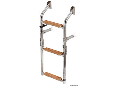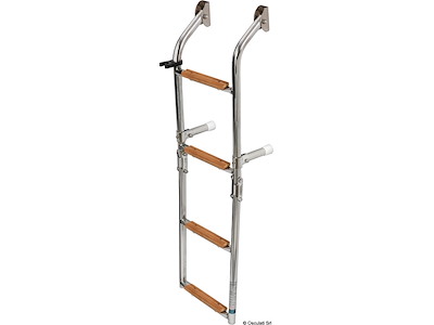 In acciaio inox lucidata a specchio con gradini in Iroko. Molto elegante e comoda, pieghevole a metà, con speciale snodo ricavato da barra inox.
