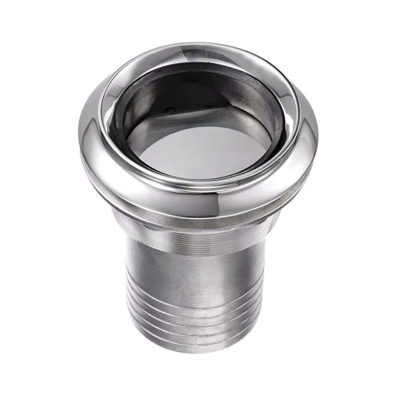 Bocchettone scarico motore in acciaio inox AISI 316, con paletta per evitare il riflusso dell’acqua verso il motore. Bordo esterno con scanalatura per evitare all’acqua di scarico del motore di sporcare la poppa della barca. Completo di controflangia per il fissaggio.