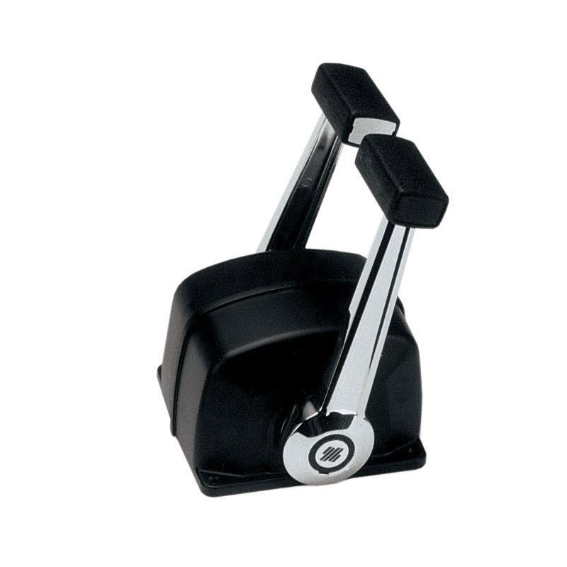 Scatole di comando versione bileva per due motori ad azione doppia per il controllo del gas e dell’invertitore. Adatte a qualsiasi tipo d’imbarcazione con motore fuoribordo, entrobordo e gruppi poppieri provvisti d’invertitore idraulico. Rendono più facile e sicura la guida evitando automaticamente I’innesto dell’invertitore se il gas non é al minimo. Sono realizzate in alluminio pressofuso, verniciate o cromate. Tirando fuori la leva si disinnesta I’invertitore durante I’operazione di riscaldamento del motore. Mediante I’interruttore di sicurezza X12 (optional), I’avviamento del motore si ottiene solamente con I’invertitore in posizione di folle. I modelli con trim presentano nell’impugnatura un interruttore che permette la regolazione dell’alzo piede dei motori fuoribordo e nei gruppi poppieri. Utilizzano i cavi per il comando motore C2-C8-C14 e Mach 0-14. Con il cavo C5-C16 e Mach 5 occorre il kit di adattamento K35 art. 4242069.