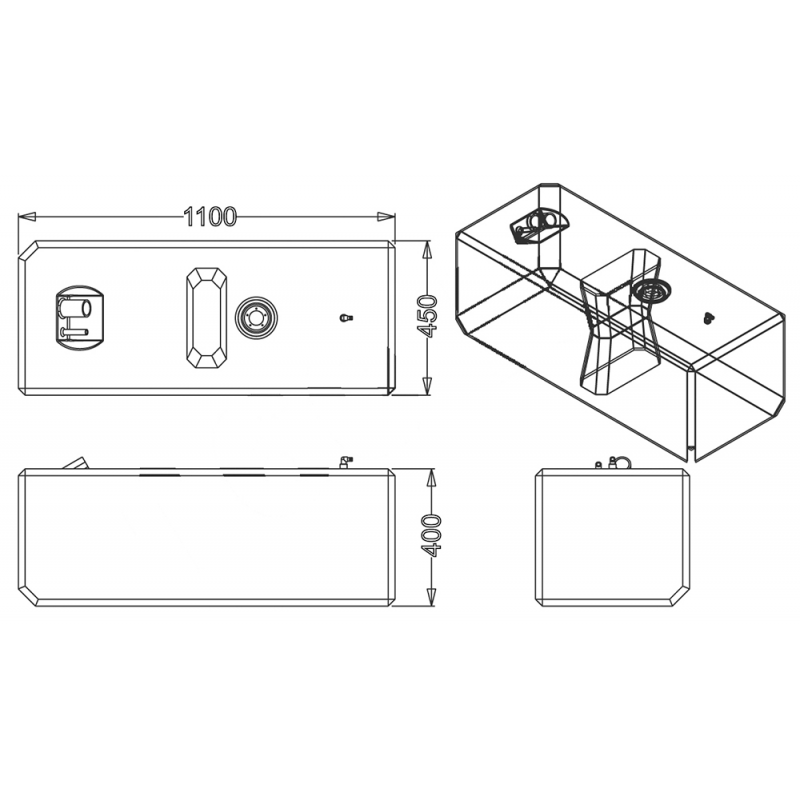 Serbatoio rigido per carburante costruito in polietilene reticolato di colore neutro, certificato CE in accordo con la direttiva 94/25/CE secondo normativa 10088 e ISO 21487.Inserti per imbarco, sfiato Ø mm. 16, pescante e ritorno Ø mm. 12. Ogniserbatoio è collaudato singolarmente.