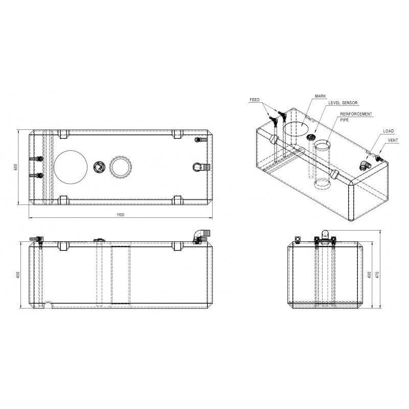 Serbatoio rigido per carburante benzina costruito in polietilene reticolato di colore neutro, certificato CE in accordo con la direttiva 94/25/CE secondo normativa 10088 e ISO 21487.Provvisto di sensore di livello universale, può funzionare o a 10-180 ohm o a 240-33 ohm vedere le istruzioni, inserti per imbarco, sfiato Ø mm 16, pescante e ritorno Ø mm 12. Ogni serbatoio è collaudato singolarmente.