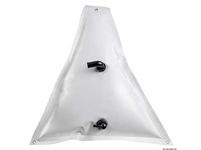 Serbatoi in PVC alimentare per stoccaggio acqua. Realizzati in tessuto PVC alimentare senza tereftalati, si adattano facilmente alle forme di sentine o gavoni. La resistenza del tessuto e la doppia saldatura ad alta tenuta garantiscono una lunga durata nel tempo. Sono dotati di due boccole saldate con filetto maschio G 1 ½ . Forniti con portagomma a girello da Ø 38 per il carico e Ø 16 per lo scarico. Per l’installazione è possibile fissare il serbatoio agli occhielli in metallo.