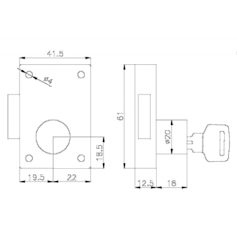 Serrature in ottone cromato quadro mm. 8 da appoggio, ad una mandata, misura mm. 60 x 40, cilindro Ø mm. 20, sporgenza cilindro mm. 15.