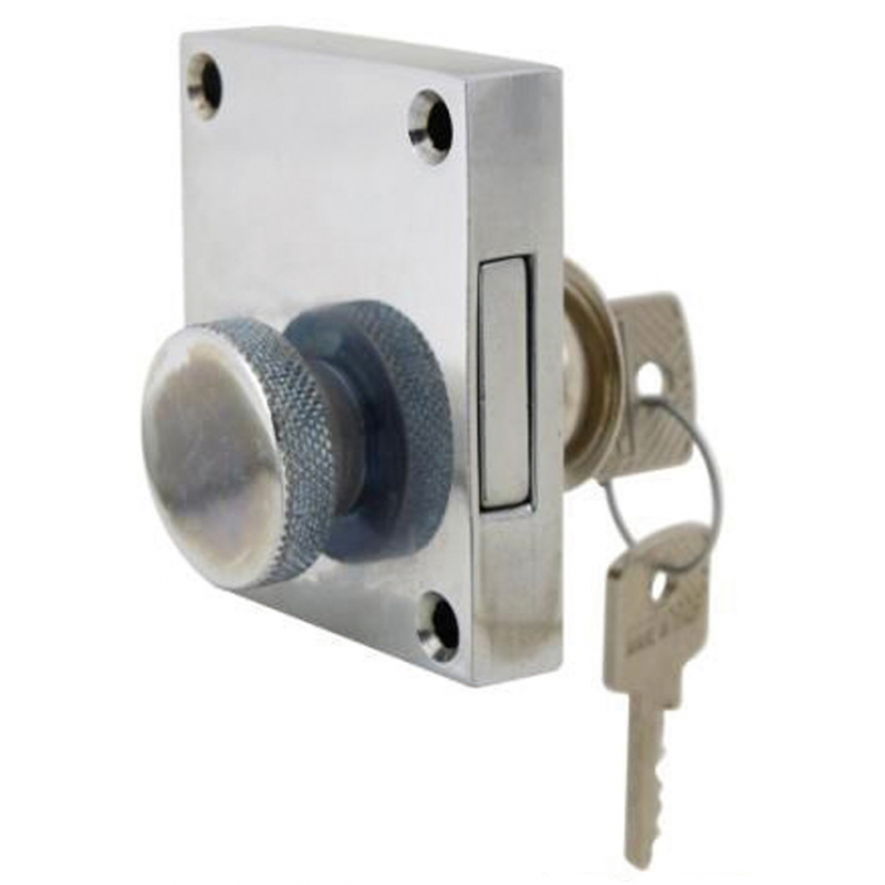 Serratura da appoggio in ottone cromato quadro mm. 8, con cilindro all’esterno e pomolo all’interno a due mandate, misura mm. 62x53, cilindro Ø mm. 20, sporgenza cilindro mm. 22.