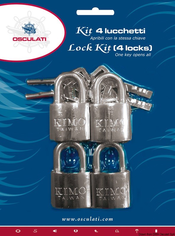 Quattro lucchetti in blister espositivo con quattro chiavi uguali. Corpo in ottone cromato ed arco in acciaio inox.
