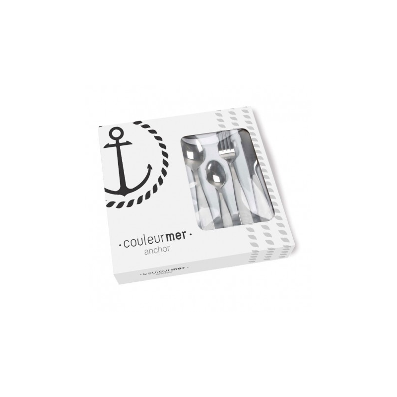Set per 6 persone di posate in acciaio inox lavabili in lavastoviglie composto da n. 24 pezzi totali: n. 6 cucchiai, n. 6 forchette, n. 6 coltelli, n. 6 cucchiaini da caffé. Modello: ANCHOR