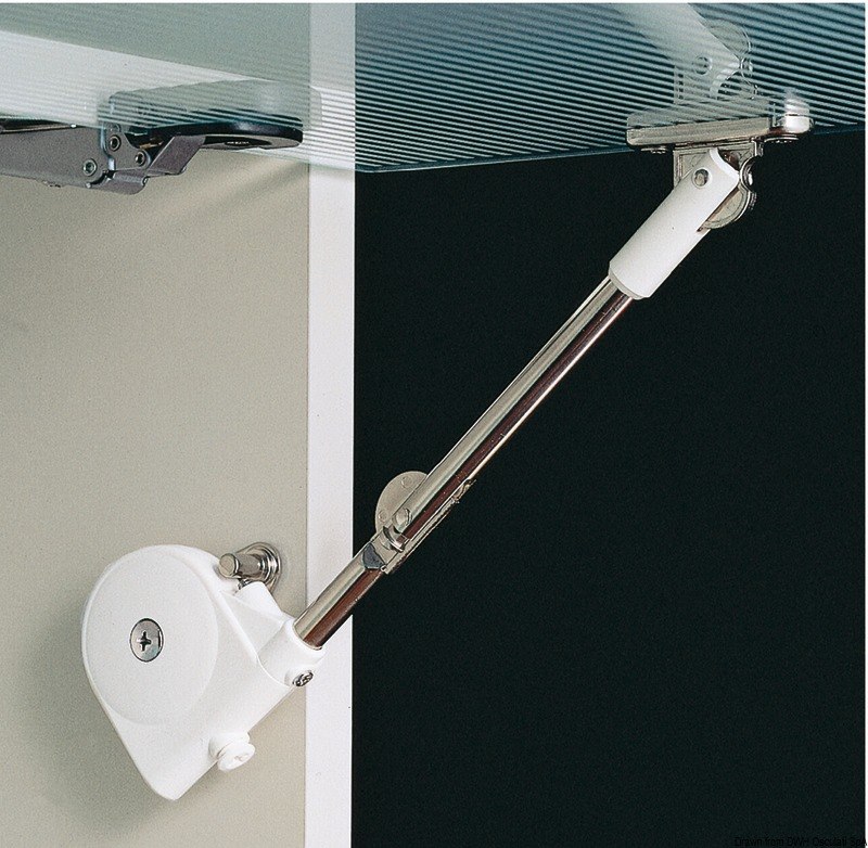 Una volta alzato lo sportello il braccetto lo tiene in posizione, alla chiusura il braccetto ammortizza la discesa fino al completo arresto dell’antina. Colore bianco. Venduto completo di piastrina di montaggio. Calcolo momento torcente. Un braccetto: lunghezza antina (cm) x 1/2 x peso antina (kg).