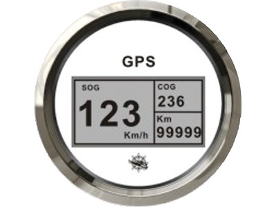 - Tipo 2: Spidometro / totalizzatore / bussola: indica in modo digitale la velocità 0/999 nodi, Km/h o MPH, la distanza percorsa fino a 99999 miglia e la rotta bussola (di grado in grado).