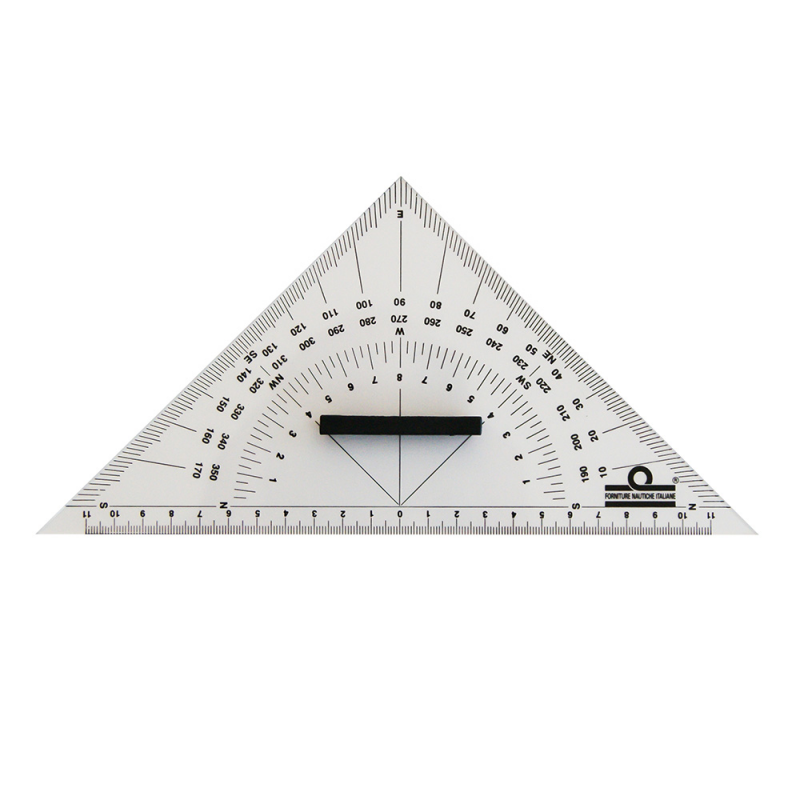 Squadra nautica in plexiglas trasparente con maniglia. Doppio goniometro incorporato e gradazione in millimetri. Lunghezza ipotenusa mm 250. Conf. 8 pz.