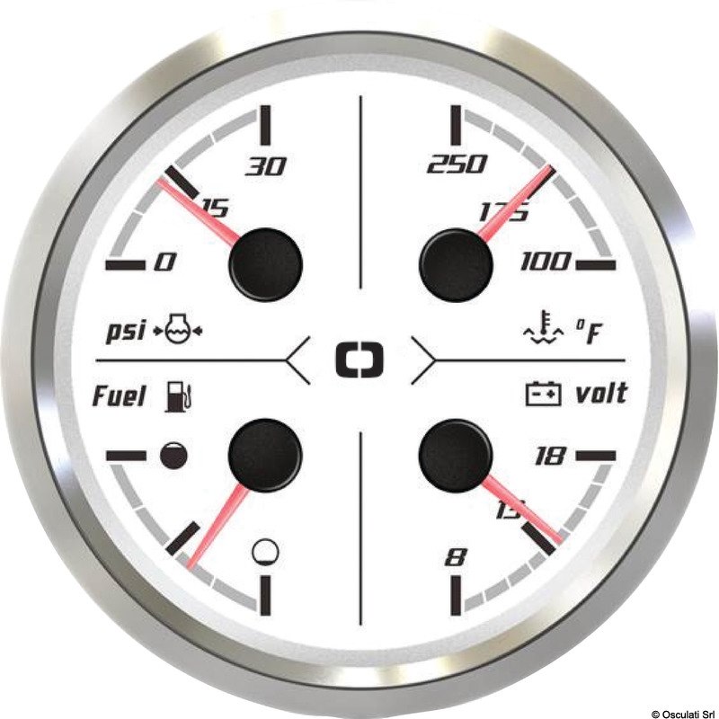 Strumento multifunzionale, sono presenti 4 funzioni sul display: - livello carburante (240-33/0-190 Ω selezionabile, allarme "basso livello carburante" 1/4); - misurazione pressione olio (0-30 psi, 10-45 Ω, con allarme bassa pressione); - misurazione temperatura dell'acqua (100-250 °F, 300~19 Ω, allarme alto a 194 °F); - Volt (8-18 V, allarme a 10 V). Ghiera in acciaio inossidabile AISI 316. Vetro antiappannamento rinorzato a doppio strato. Dimensioni di installazione: 85 mm. Classe di protezione: IP67. Facile installazione grazie al design di collegamento multi-presa.